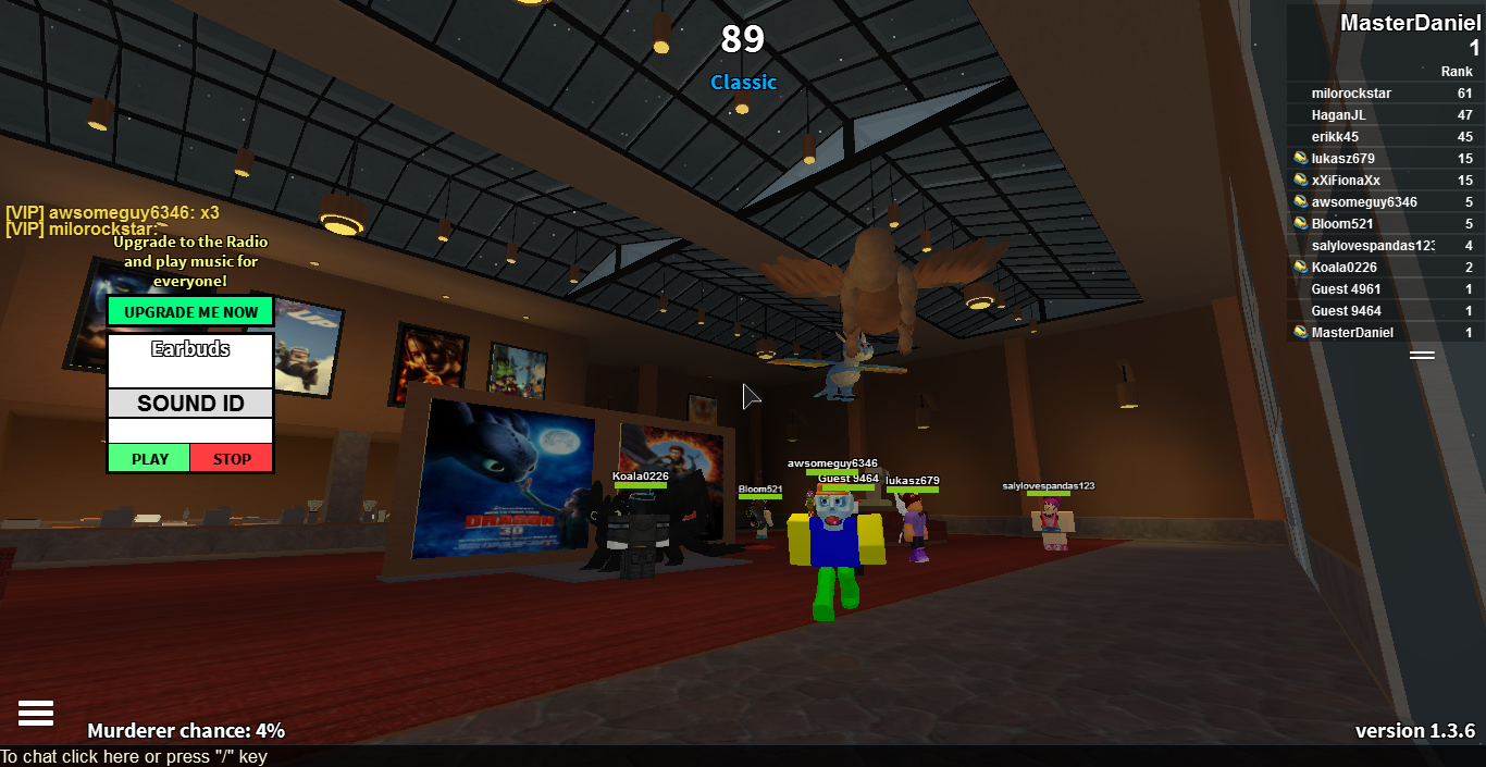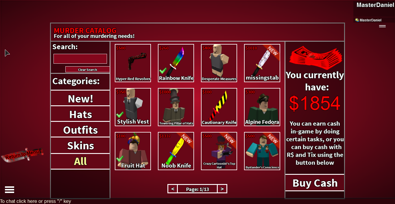 This game is pretty enjoyable. There is a deep satisfaction to being the murderer and winning, or saving all those innocents when you're the Sheriff. There are game passes available for outrageous prices that can make you the murderer more often and this is one negative of the game. The game seems pretty enjoyable though so I'll give it a 8.