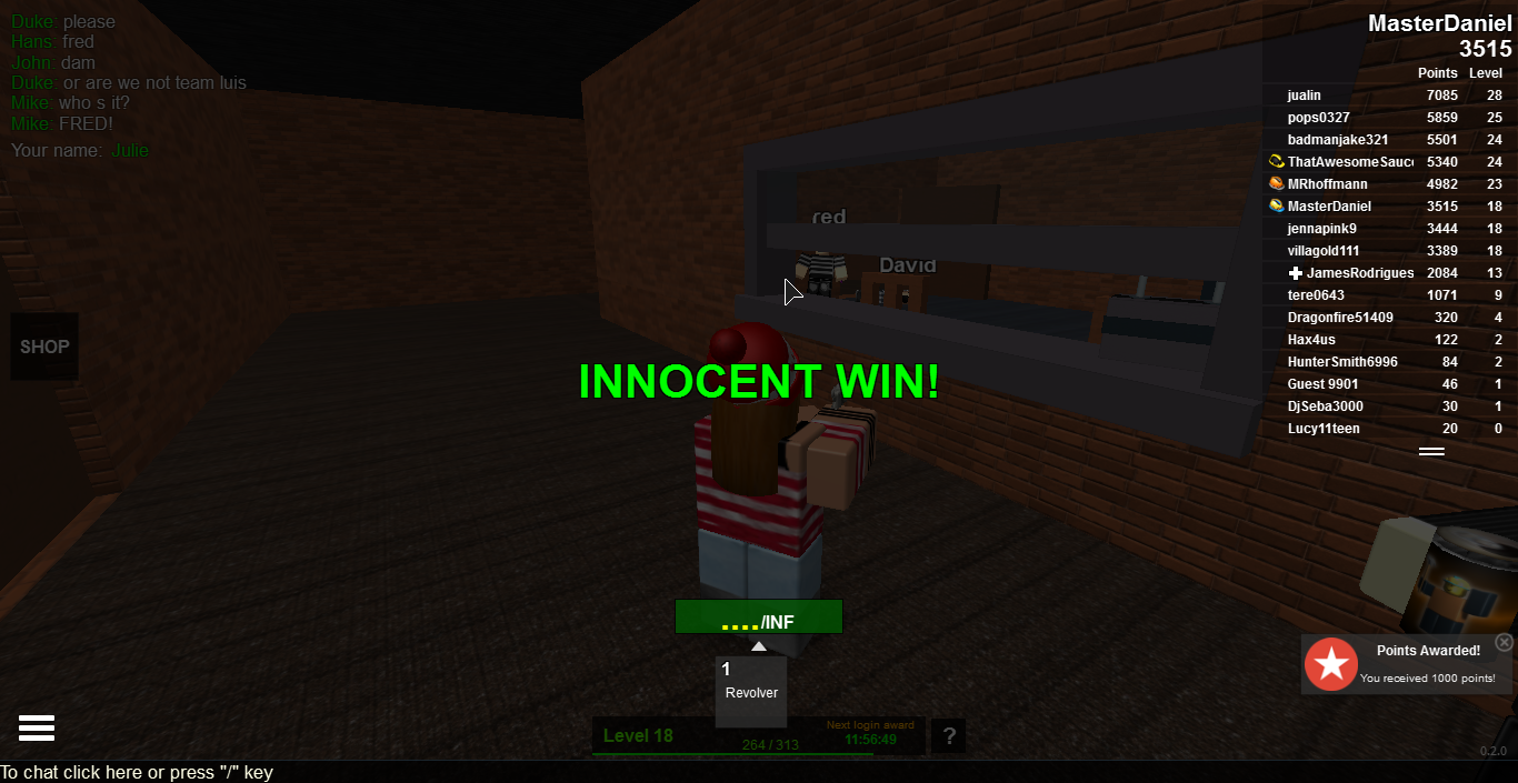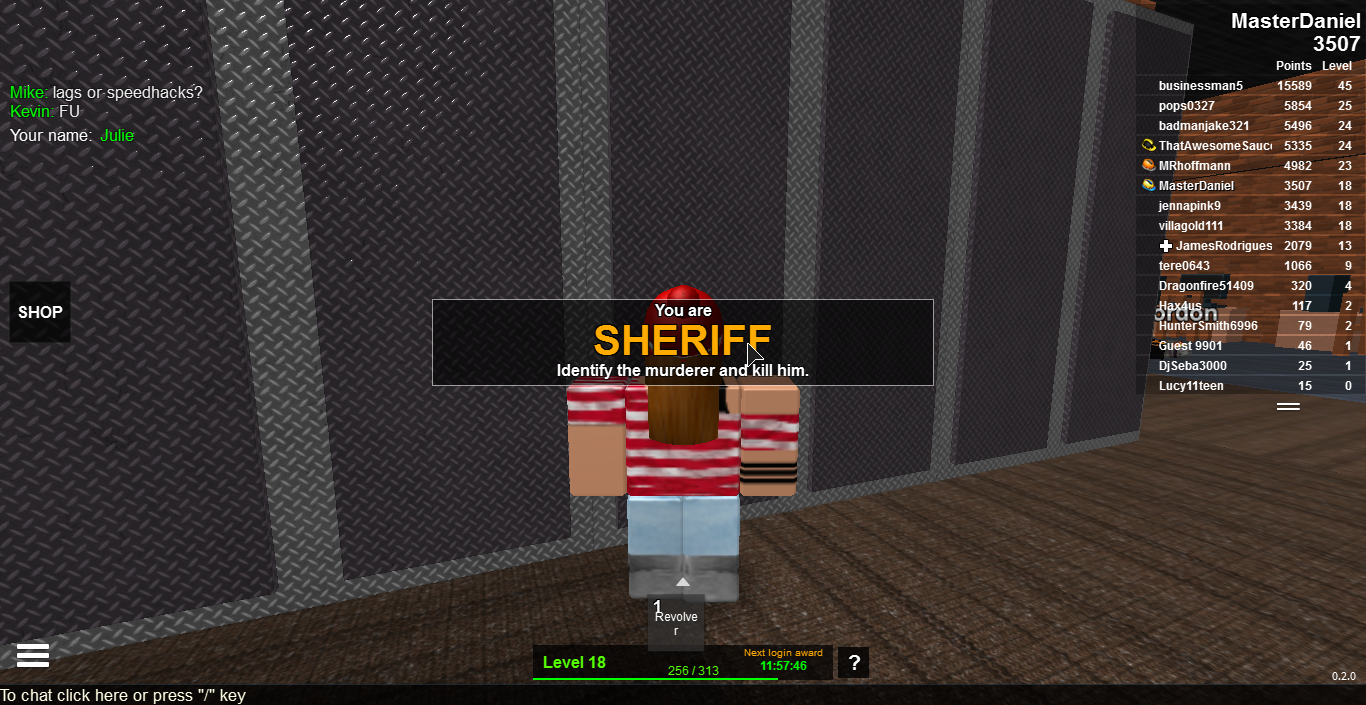 This game is very enjoyable. Its so satisfying killing the murderer or the innocents or just running and trying to hide from the Murderer. Nikilis has made this into a very enjoyable game and unlike Murder which I'll review next, it has a large social aspect where people are also discussing who they think the murderer is in the chat - until they die of course!